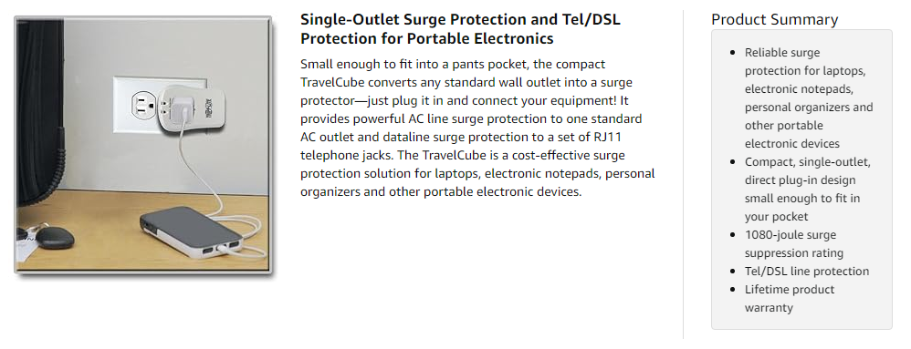 The TravelCube provides 1080 joules of surge suppression to prevent surges from damaging your valuable electronics. Includes full normal mode (H-N) and common mode (N-G/H-G) line surge suppression.