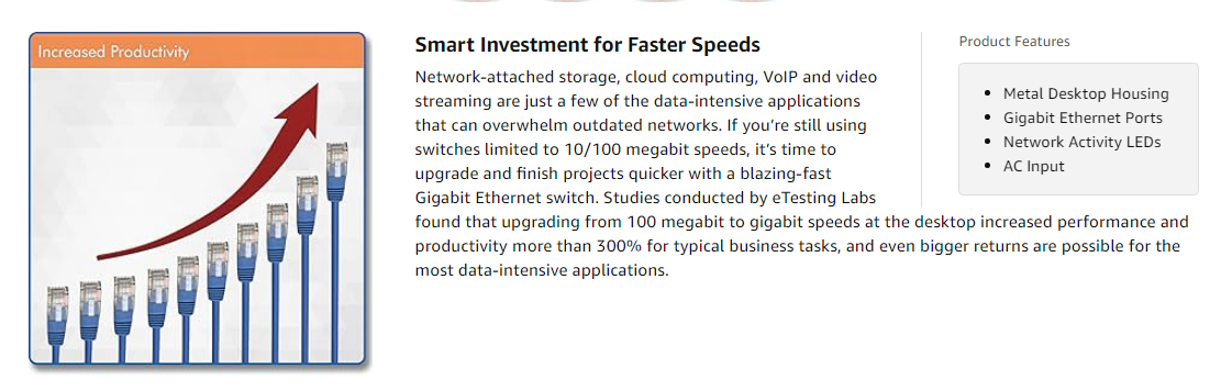 Gigabit Speed for Homes and OfficesThis cost-effective network switch was designed for the needs of home users and small businesses. It combines easy setup, blazing-fast network speeds, trouble-free operation and rock-solid reliability with outstanding value. |
