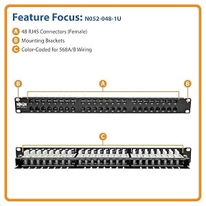 The N052-048-1U is constructed of heavy-duty 14ga cold-rolled steel, and all components meet or exceed ANSI/TIA-568-C.2, ISO/IEC 11801 and IEC 60603-7 category standards.