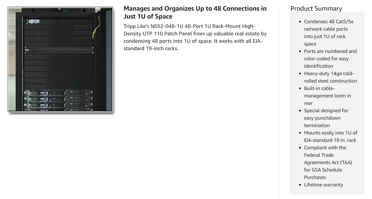 When you choose this Tripp Lite product, you get superior performance plus peace of mind. We’re so confident of its quality that we warrant it to be free from defects in material and workmanship for life! The N052-048-1U is also manufactured in compliance with strict RoHS specifications, reflecting Tripp Lite’s commitment to environmental responsibility.