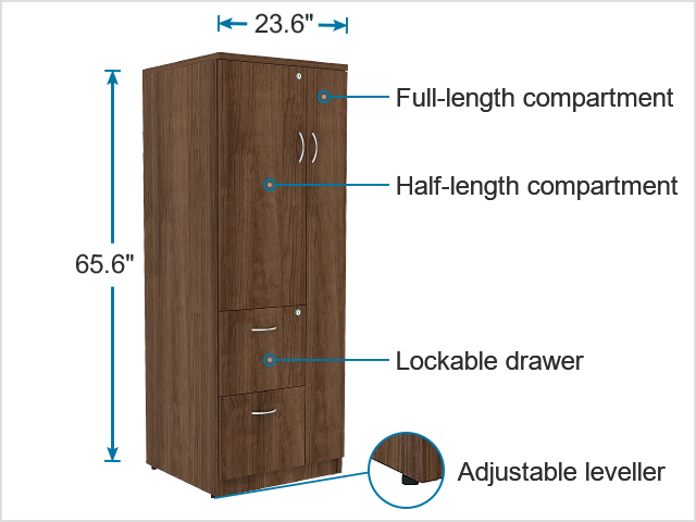 THE LLR69889 storage cabinet is designed to expand your storage opportunities with varied sizes of compartments. Full-length compartment on the right features a door to conceal contents. On the left, the half-length compartment includes a locking door and two shelves. The bottom two drawers lock to secure your belongings and hold letter-size files.