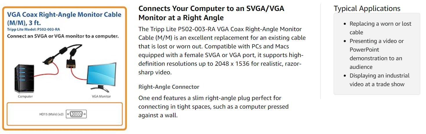 The three-foot molded cable features premium foil and braid shielding, as well as mini-coax (RGB) and paired video wire construction, to deliver top-of-the-line signal quality and protection from EMI/RFI interference. Gold-plated HD15 male connectors with gold-plated copper contacts ensure excellent conductivity. Integral strain relief ensures the cable and connectors last a long time.