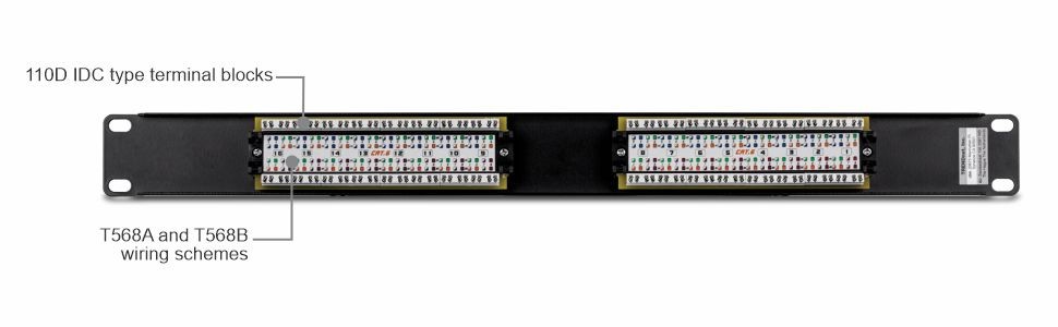 CAT 5e grade Krone connectors with color-coded labeling for T568A and 568B wiring schemes. 1000Base-T Gigabit Copper Ethernet ready.Backward compatible with CAT 3, 4 and 5 cabling. Complies with EIA / TIA 568A and ISO / IEC 11801.