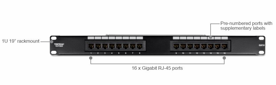 Get ready for copper Gigabit Ethernet with TRENDnet's CAT 5e RJ-45 UTP patch panels. These patch panels are certified 100Mhz CAT 5e, which is required for Gigabit Ethernet copper. TRENDnet's 16-Port 100 MHz Enhanced CAT 5 Patch Panels are ideal for Ethernet / Fast Ethernet / Gigabit Ethernet (1000Base-T) network applications. Using TRENDnet's CAT 5e now will prepare you for more bandwidth in the future without rewiring your network.