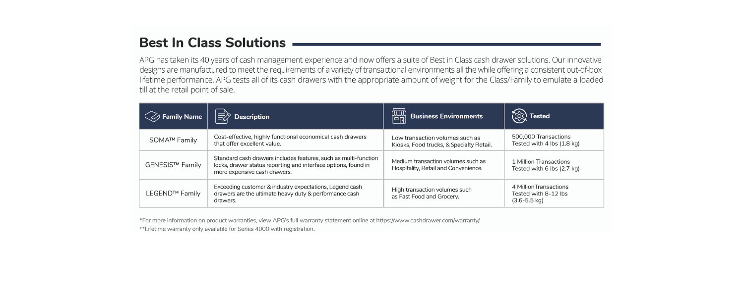 Equipped with apg®’s MultiPRO 320 interface that is compatible with all 24V printer-driven POS systems. Please note a connection cable is not included with the purchase.