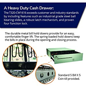 The drawer comes complete with an under the till storage area for storing checks, credit card receipts, or other transaction paper. Drawer measures at 16.0”x 16.8” x 4.9”.