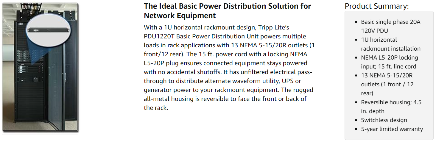 The PDU1220T comes backed by a 5-year warranty and is manufactured in compliance with strict RoHS specifications, reflecting Tripp Lite’s commitment to environmental responsibility.