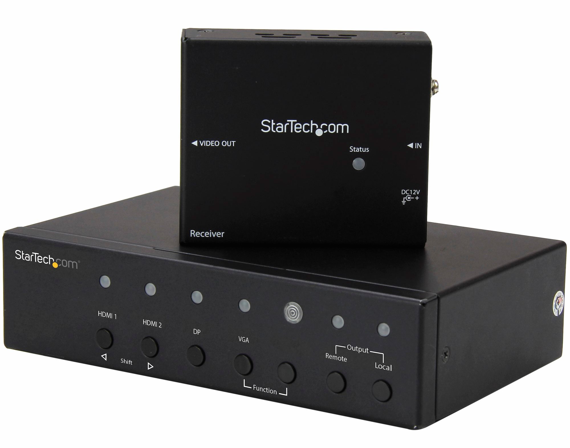 This HDBaseT extender features a built-in converter switch, so you can connect two HDMI sources as well as a VGA and a DisplayPort video source to the same remote HDMI display, without having to use additional adapters or scalers or a separate video switch.