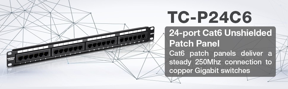 Get ready for copper Gigabit Ethernet with TRENDnet's jack. 6 RJ-45 UTP patch panels. These patch panels are certified for 250Mhz Category 6, which is perfect for copper Gigabit Ethernet connections. TRENDnet 24-port Cat. 6 patch panels are ideal for Ethernet, Fast Ethernet, and copper Gigabit Ethernet (1000Base-T) network applications. Using the TRENDnet cat. 6 products now, will prepare you for high-bandwidth networking in the future without rewiring your network.