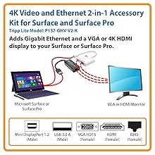Allows You to View Content on a Larger ScreenFor displaying videos, spreadsheets, documents and presentations on a larger screen, the P137-GHV-V2-K’s Mini DisplayPort to VGA/HDMI adapter has separate HD15 and HDMI female ports for connecting your Surface’s Mini DisplayPort to a VGA or HDMI monitor, television or projector. The VGA connection supports video resolutions up to 1920 x 1200, including 1080p. The HDMI connection supports UHD resolutions up to 3840 x 2160 (4K x 2K) at 24/30 Hz, as well as 36-bit Deep Color (12 bits per channel). |