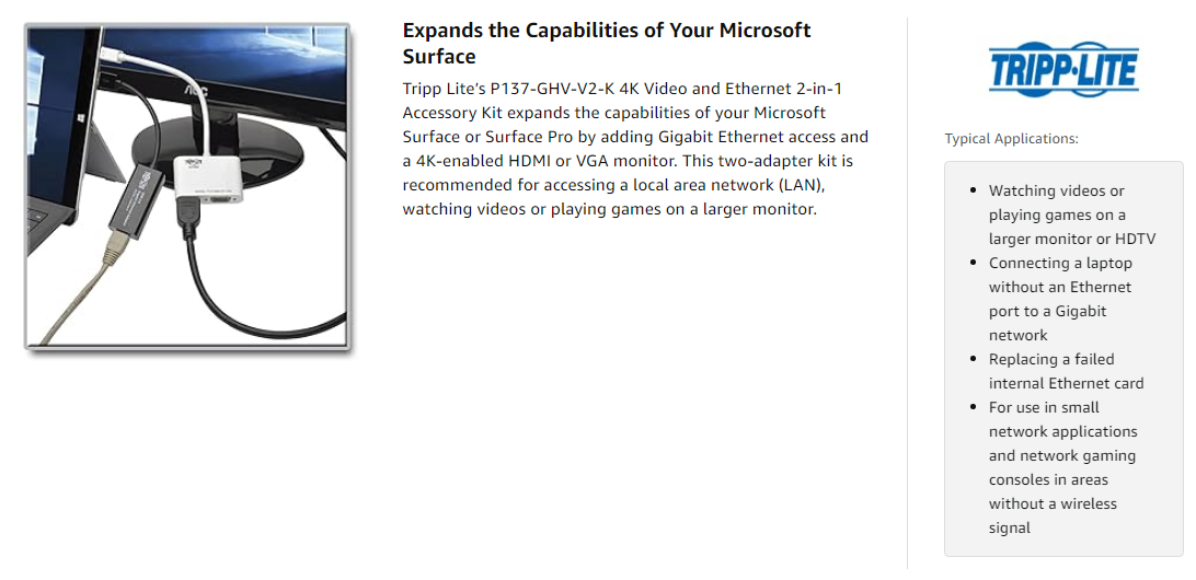 Converts Your Surface Tablet Into a Network DeviceThe P137-GHV-V2-K’s USB 3.0 SuperSpeed to Gigabit Ethernet adapter allows you to access a 10/100/1000 Mbps wired network without an internal Ethernet card. It achieves data transfer speeds up to 5 Gbps without compromising signal quality. It complies with IEEE 802.3 (10Base-T) and 802.3u (100Base-TX) standards and supports IEEE 802.3az Energy Efficient Ethernet, as well as full- and half-duplex operations, suspend mode and remote wakeup via link-up, and magic packet. |