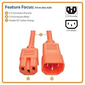 The P018-006-AOR features an orange SJT jacket and fully molded orange ends, allowing you to easily identify your connections in a crowded rack or workstation.