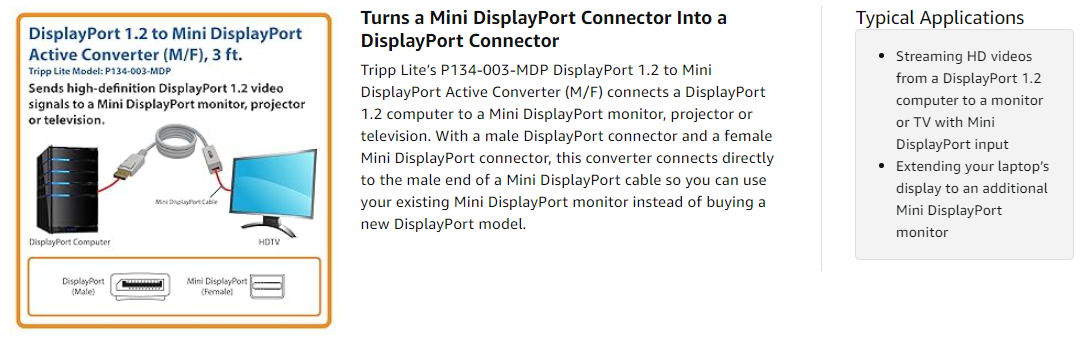 Ideal for displaying video on a large monitor or digital sign, the P134-003-MDP supports high-definition video resolutions of up to 1920 x 1080 (1080p) and computer video resolutions of up to 1920 x 1200. Because it’s an active converter, the P134-003-MDP converts both Single-Mode and Dual-Mode (DP++) DisplayPort output. It’s perfect for use with graphics cards, such as AMD Eyefinity, that do not output DP++ signals.