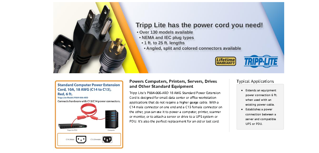 When you choose this genuine Tripp Lite power cord, you get superior performance plus peace of mind. We’re so confident of its quality that we warrant it to be free from defects in material and workmanship for life! The P004-006-ARD is also manufactured in compliance with strict RoHS specifications, reflecting Tripp Lite’s commitment to environmental responsibility.