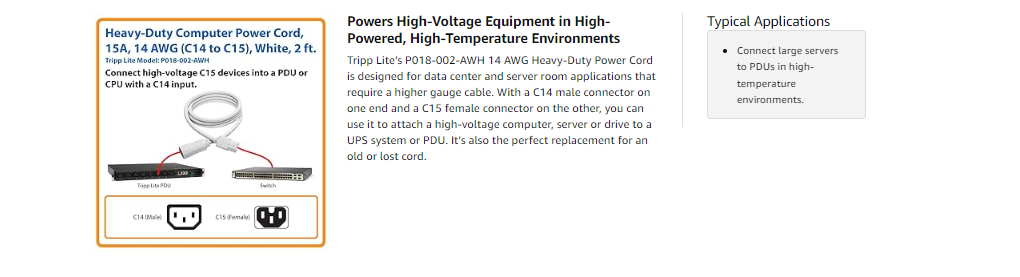 With support for up to 250V, this two-foot 15A cord is compatible with Cisco, HP and other C15-equipped hardware. It’s UL-listed and features a flexible SJT jacket and 14 AWG wire for easy routing through tight areas.