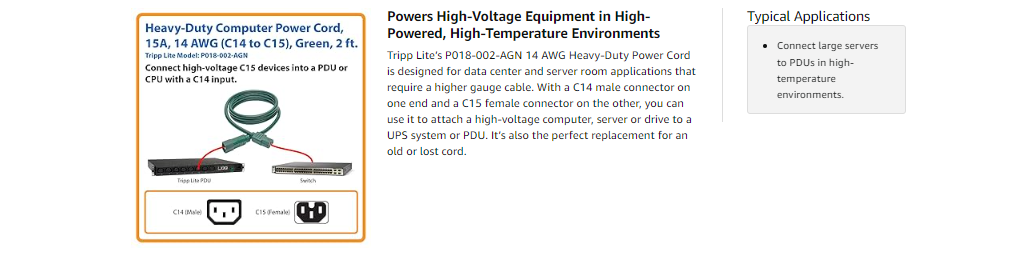 With support for up to 250V, this two-foot 15A cord is compatible with Cisco, HP and other C15-equipped hardware. It’s UL-listed and features a flexible SJT jacket and 14 AWG wire for easy routing through tight areas.
