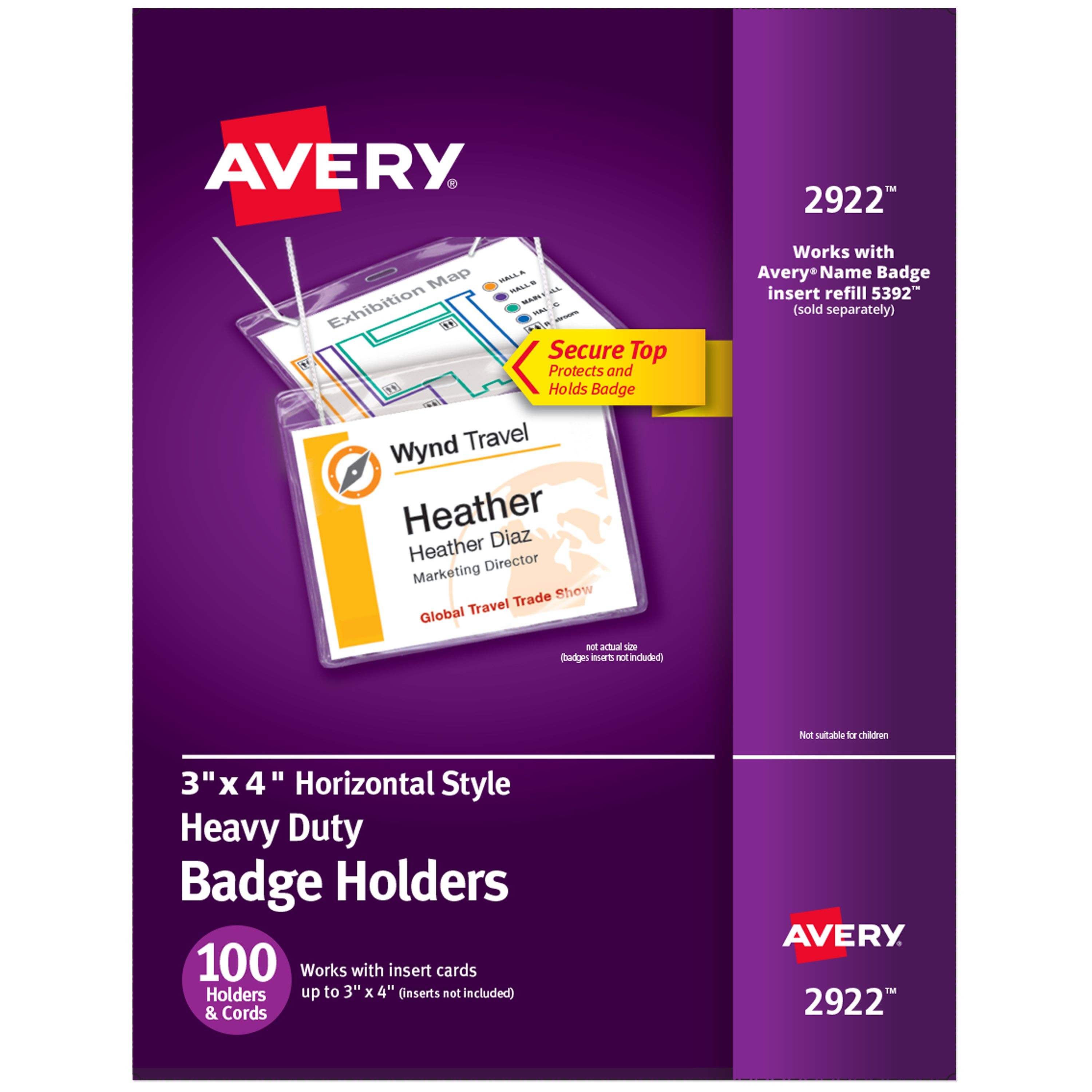 Make sure your ID cards, name badges, access cards, and other identification are always easily accessible with Avery 2922 Heavy Duty Badge Holders with cords. This pack of 100 horizontal 3" x 4" badge holders is durable enough for everyday use and perfect for multi-day events such as meetings, trade shows, seminars, and conventions. The durable plastic holder is reusable and features our Secure Top design that prevents cards and other inserts from falling out. The name badge kit set also comes with 36" non-elastic neck cords that easily loop onto the pre-punched holder. Hang it around your neck for easy access when on the go. Compatible with