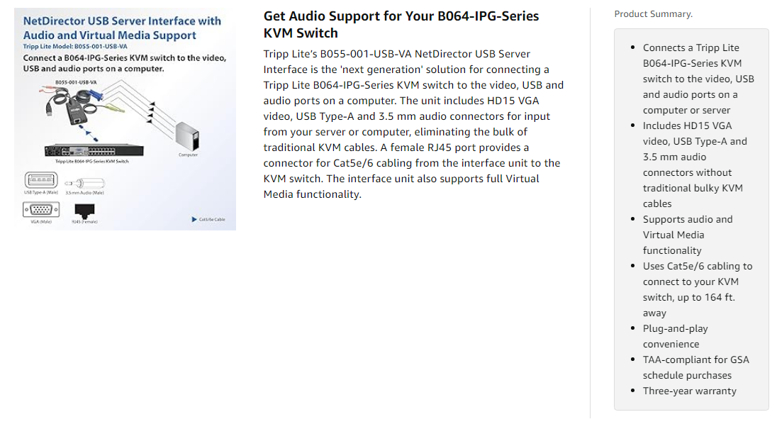 The B055-001-USB-VA is compliant with the Federal Trade Agreements Act (TAA) for GSA Schedule purchases.