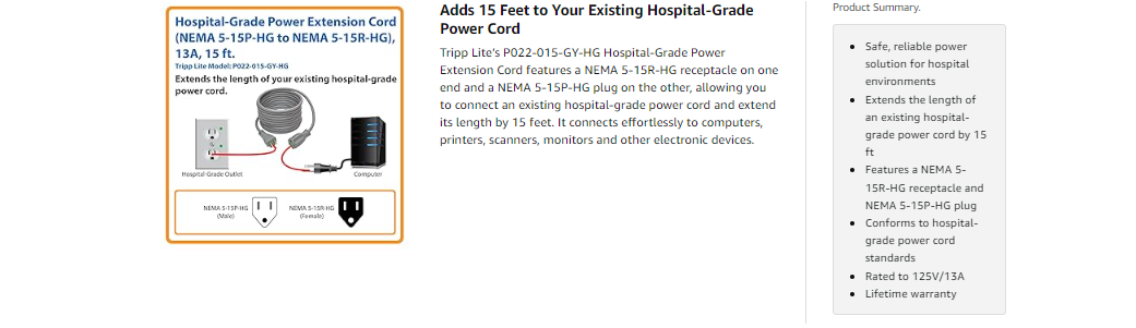 This gray, 13A cord is tested to ANSI/UL 62 and 817 as well as CAN/CSA C22.2 no. 21 and 42 standards, making it a safe, reliable power solution for hospital environments.
