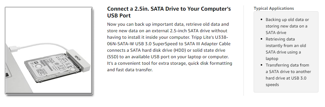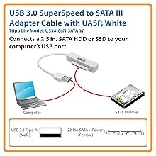 Supports USB 3.0 and UASPThe U338-06N-SATA-W supports USB 3.0 data transfer rates up to 5 Gbps and is backward-compatible with previous USB generations. When connected to a UASP-enabled (USB Attached SCSI Protocol) host controller, it reads data up to 70 percent faster and writes up to 40 percent faster than USB 2.0. |