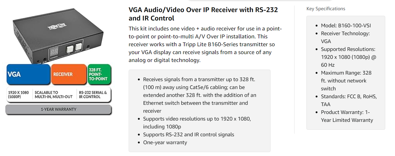 - One-Year Warranty: For peace of mind, the B160-100-VSI is covered by a one-year warranty.