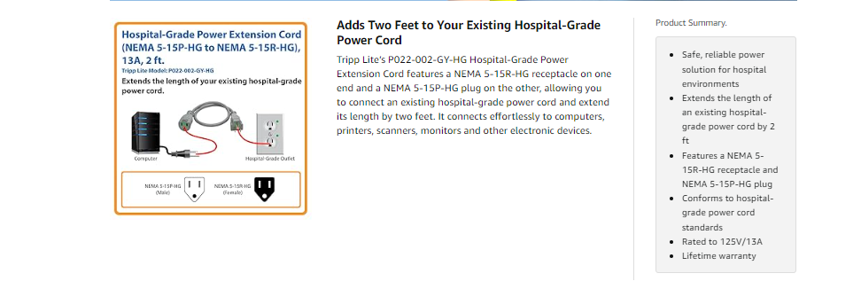 This gray, 13A cord is tested to ANSI/UL 62 and 817 as well as CAN/CSA C22.2 no. 21 and 42 standards, making it a safe, reliable power solution for hospital environments.