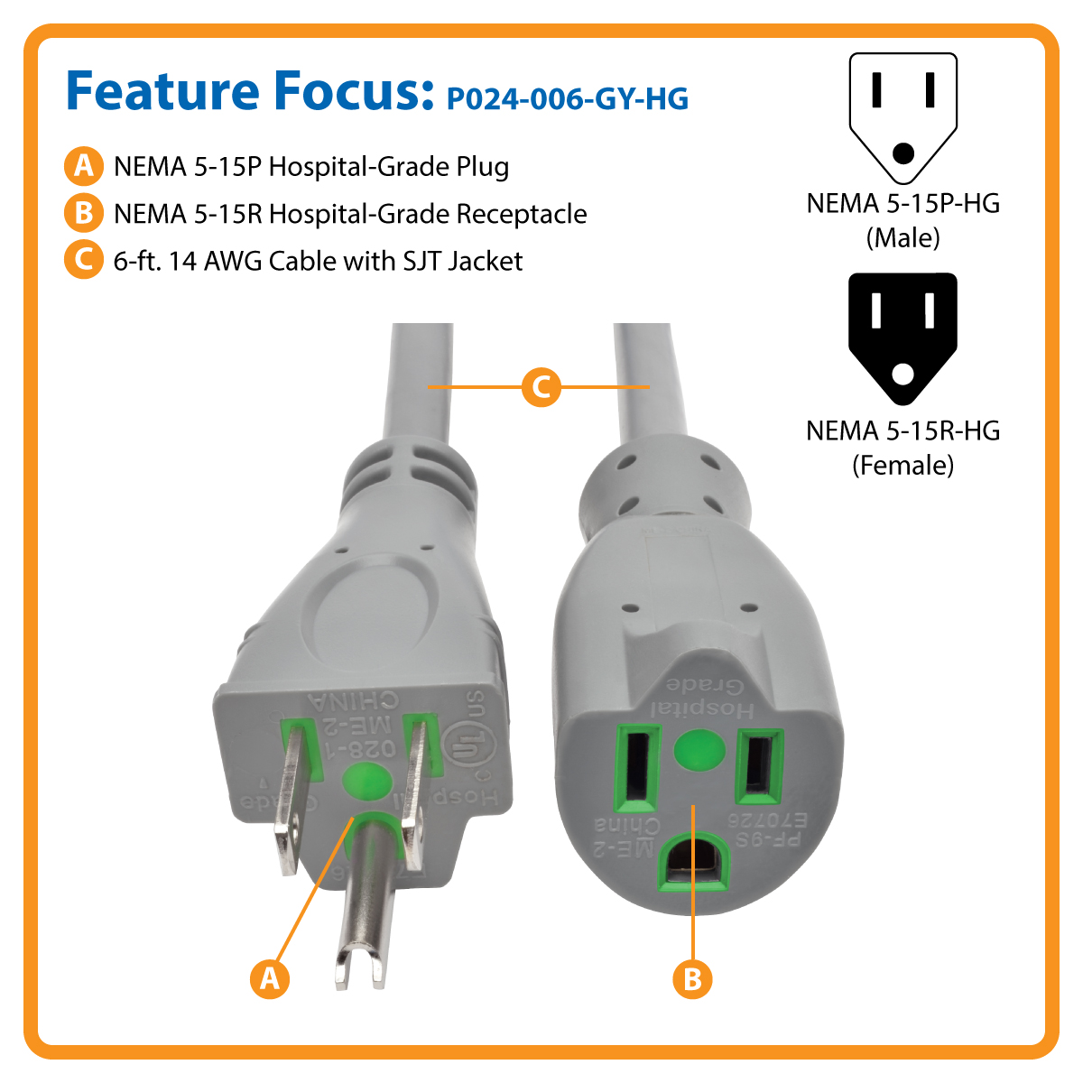 Tripp Lite’s P024-006-GY-HG Hospital-Grade Power Extension Cord features a NEMA 5-15R-HG receptacle on one end and a NEMA 5-15P-HG plug on the other, allowing you to connect an existing hospital-grade power cord and extend its length by six feet. It connects effortlessly to computers, printers, scanners, monitors and other electronic devices.