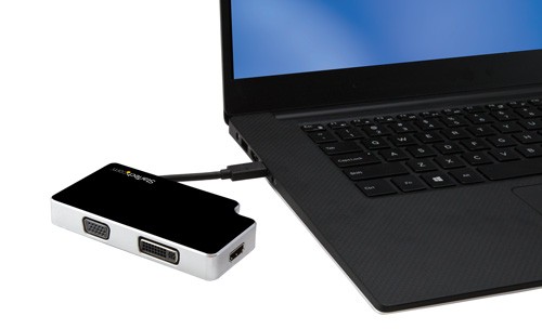 Instead of carrying three separate video adapters in your laptop bag, this 3-in-1 adapter gives you all the video outputs you'll need. With VGA, DVI and HDMI outputs, this adapter lets you connect from your laptop's USB Type-C port to almost any boardroom or classroom display, without the inconvenience of carrying a separate adapter for each display type.