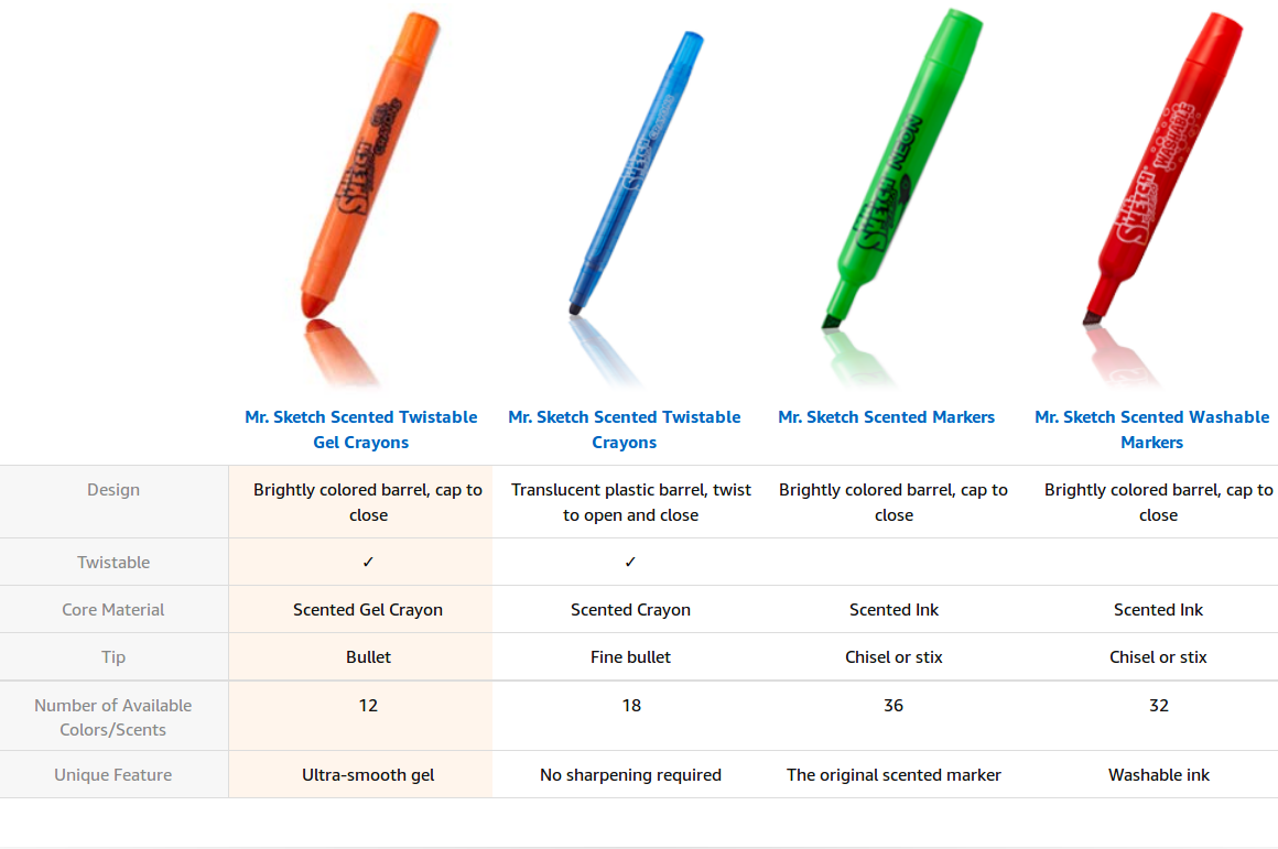 Mr. Sketch is the original scented marker and continues to provide a fun, vibrant experience for kids. Each one of the bright colors comes with its own unique scent, like Blueberry and Apple, to unleash students’ creativity. With over 50 years creating innovative children’s art products, the Mr. Sketch lineup has expanded to include both washable and non-washable markers and scented crayons. The fun aromas and bold colors are perfect for sparking young artists’ imagination.