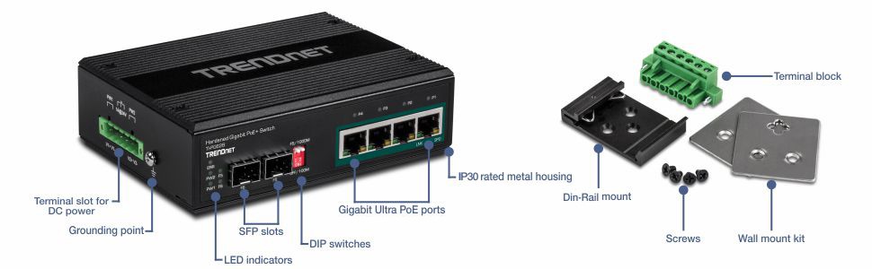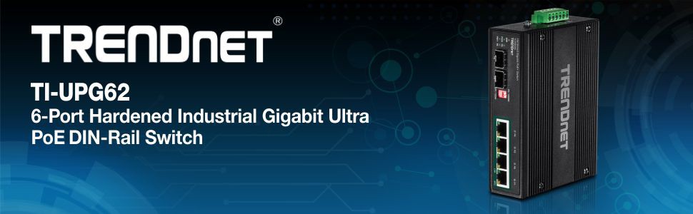 TRENDnet's TI-UPG62 is a reliable IP30 unmanaged DIN-Rail PoE++ switch with a rugged housing rated for extreme industrial environments. It offers 4 Gigabit PoE++ ports, a 240W PoE power budget, two dedicated SFP slots, and a 12 Gbps switching capacity. This hardened industrial switch features multiple redundant power inputs and a power failure alarm relay.