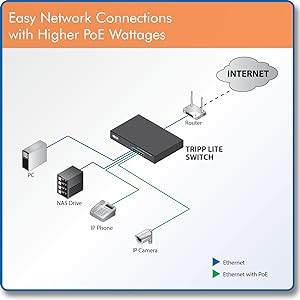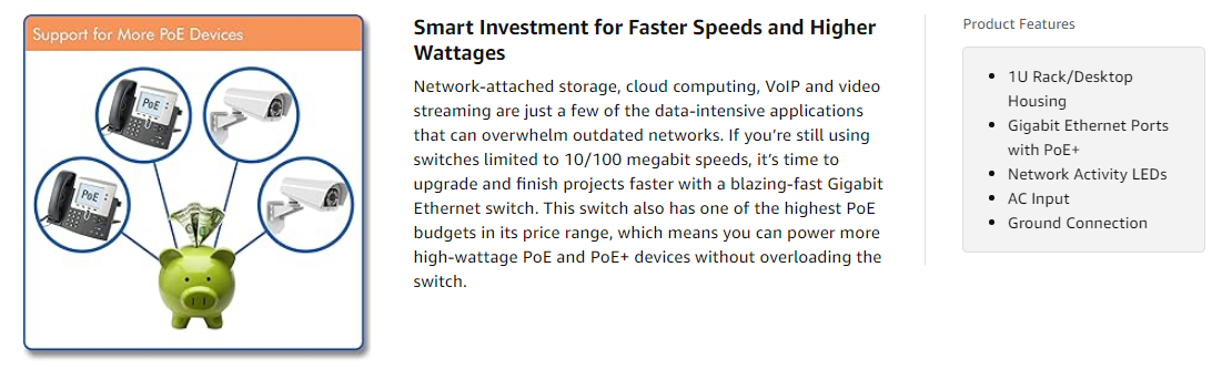 Power over Ethernet (PoE) delivers convenient in-line power to compatible equipment like security cameras, wireless access points, routers, IP phones, access control devices, PA speakers and sensors. This switch has one of the highest total PoE wattage budgets in its price range, which means you can power more devices without overloading the switch. It also supports the PoE+ standard to deliver more watts per port and drive the latest power-hungry devices while maintaining complete compatibility with lower-wattage devices. This energy-efficient network switch sets inactive ports to a power-saving standby mode. It also optimizes energy used by active ports to match cable length. This happens automatically, without any reduction in speed or reliability. In fact, energy-efficient switches typically last longer because they run cooler.