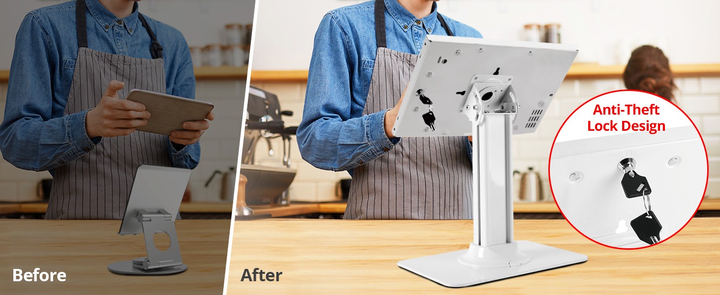 Bolted base and lockable key keeps ipad secure for restaurants, retail store, school, office, POS kiosk or commercial use