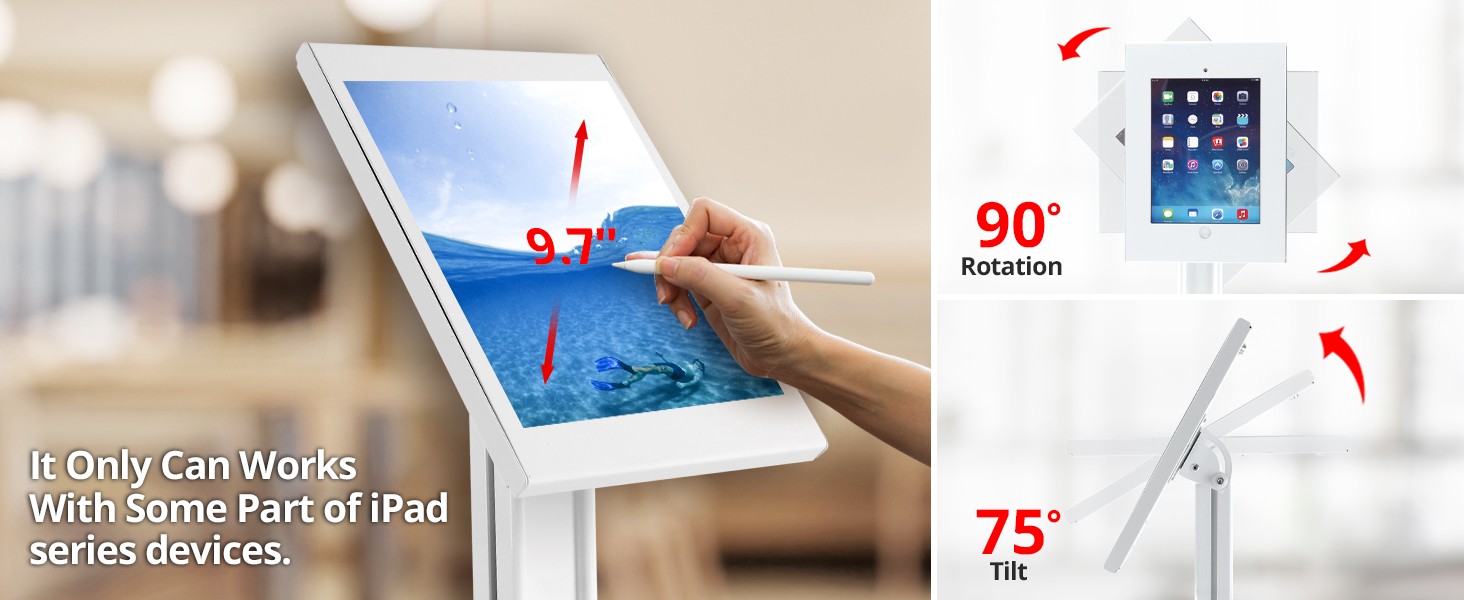 Fully fit 9.7" iPad series models on the market and the ipad will be screwed firmly inside the security stand holder