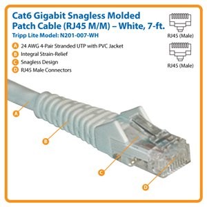 Manufactured from 24 AWG 4-pair stranded UTP with a staggered-pin plug design, the N201-007-WH provides high-speed connections and flawless signal delivery while keeping near-end crosstalk levels to a minimum. This cable can deliver speeds up to 550MHz/1 Gbps. Featuring a PVC jacket, this seven-foot Tripp Lite Cat6 Gigabit Snagless Molded Patch Cable is constructed of top-quality materials for long life and durability. Its RJ45 (male) connectors are gold-plated to ensure an accurate signal transfer. For a secure connection, the cable has molded integral strain-relief and a snagless design that protects the locking tabs on the RJ45 connectors from being damaged or snapped off during installation. The N201-007-WH meets the most current industry standards, including IEEE 802.3ab, IEEE 802.5, ANSI/EIA/TIA 568, ISO/IEC 11801 and ETL (category 6 draft 11).