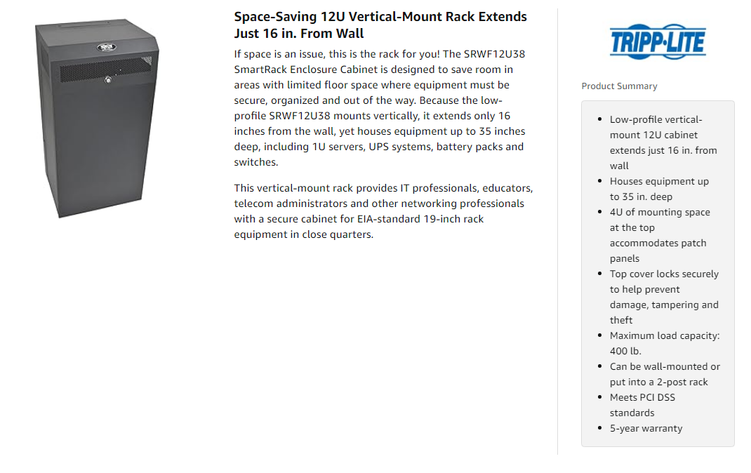 For peace of mind, the SRWF12U38 comes with a 5-year warranty. It’s manufactured in compliance with strict RoHS specifications, reflecting Tripp Lite’s commitment to environmental responsibility.