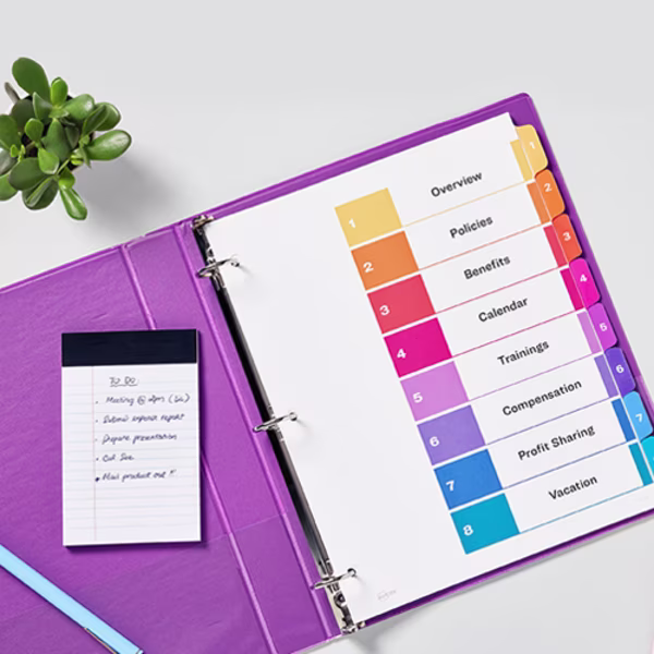 Label all tabs at once with our clear Easy Apply labels that create a printed-on look. Paper dividers are made with 100% recycled paper.