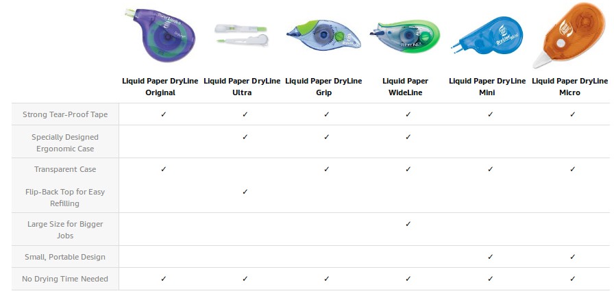 Since 1961, Liquid Paper has introduced innovative and easy-to-use correctional products to meet the needs of students and professionals alike. Offering classic correction fluid alongside newer products like Click Correct pens and DryLine correctional tape, Liquid Paper continues to have you covered.