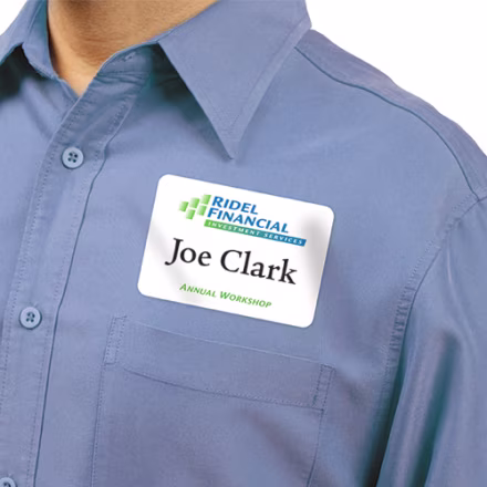 • Ideal for meetings, events, parties and seminars • Conformable badges move with clothing without falling off or edges curling • Unique peel-away design allows badges to separate easily from sheet for organizing and sorting • Available in a variety of sizes and shapes, with or without colored borders • Print-to-the-edge, inkjet/laser compatible