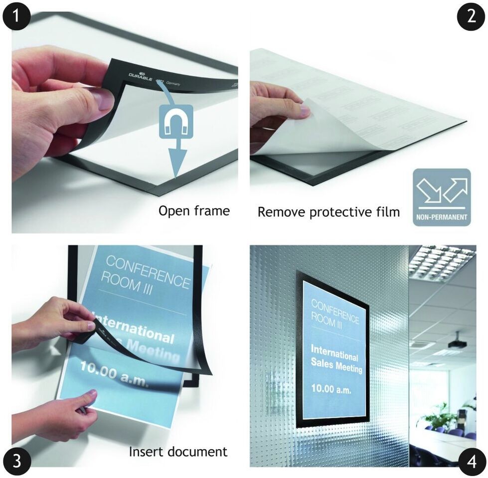 DURAFRAME is a self-adhesive infoframe with a hinged, magnetic front for quick and convenient insert exchange. It is the ideal solution for displaying information on solid and smooth surfaces.