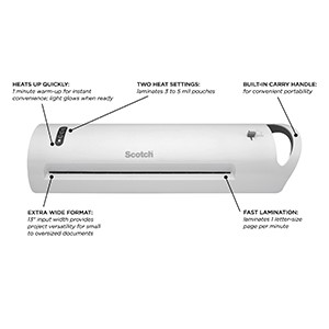 Scotch™ Advanced Thermal Laminator warms up in 1 minute. It has an extra-wide 13 inch input making it great for both small and big projects. Two heated rollers create high-quality professional, bubble and wrinkle-free results. The built-in carry handle stays cool and provides portability. Includes auto-shut off, touch button controls and two heat settings for both 3 mil and 5 mil pouches. It comes with 20 letter-size, photo-safe thermal laminating pouches.
