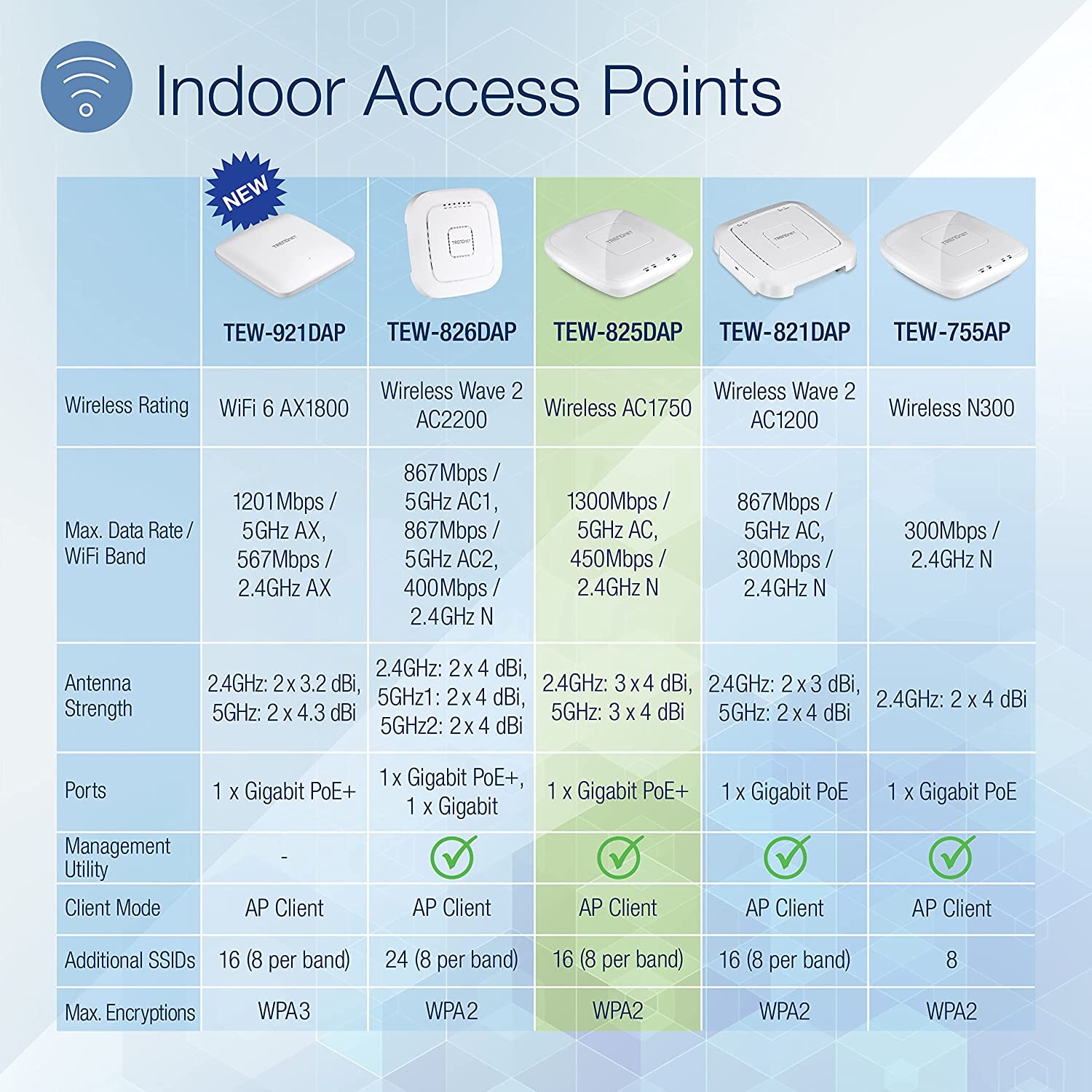 Equip your business with a manageable and cost-effective AC1750 wireless network with TRENDnet’s AC1750 Dual Band PoE+ Access Point, model TEW-825DAP. Broadcast concurrent 1300 Mbps WiFi AC and 450 Mbps WiFi N networks. Relieve congestion and overcrowding on the 2.4GHz band by employing band steer technology. Power the access point with the included AC adapter, or connect via PoE+ for installation flexibility. The low-profile design blends into most environments and includes a convenient ceiling/wall mounting plate.