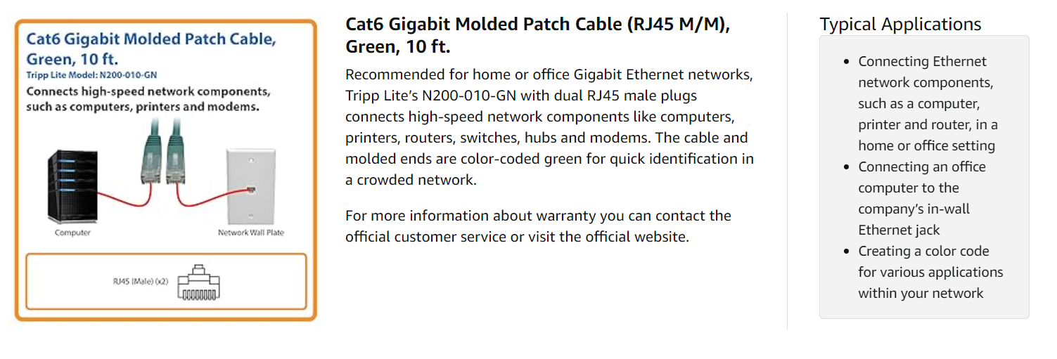 The N200-010-GN meets most current industry standards, including IEEE 802.3ab, IEEE 802.5, ANSI/EIA/TIA 568, ISO/IEC 11801 and ETL (category 6 draft 11). Its top-quality construction includes a rugged PVC jacket. Integral strain relief with ridges on each end gives the cable extra flexibility, reduces stress, and helps the cable and connectors move freely without cracking. The corrosion-resistant gold-plated copper contacts provide maximum conductivity and minimize data loss.
