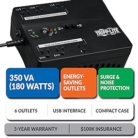 Reliable Battery Backup- Single-Computer Runtime: This UPS system will support an energy-efficient desktop computer and LCD monitor (100W load) for up to 9.4 minutes during an outage. - Half-Load Runtime: This UPS system will support a 50% load (90W) for up to 11.3 minutes. - Optimized Outlet Array: 3 outlets have both battery backup and surge/noise protection, and 3 have surge/noise protection without battery backup. |