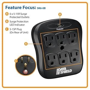 The SK6-0B triples the number of available outlets over a traditional duplex wall outlet and also protects your electronics from power surges and line noise. With its small, direct plug-in design, this surge protector is ideal for kitchen counters, living rooms, bedrooms, workstations or any other installation where physical- and outlet-space is limited for plugging in multiple devices like A/V components, appliances, computers and computer accessories—just plug it in and connect your equipment!