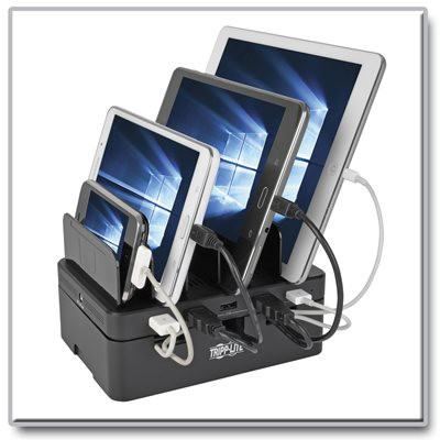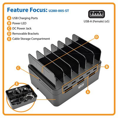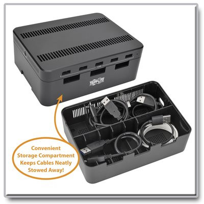 Removable brackets on top of the U280-005-ST allow it to also act as storage, providing space to neatly organize devices while they charge. Underneath the charging ports is a convenient compartment for storing and organizing cables when they are not in use.