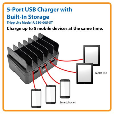 Tripp Lite’s U280-005-ST 5-Port USB Charging Station keeps your devices fully charged and ready for action. No more searching for an available outlet or unplugging one device to charge another. This compact charging station charges up to five devices at the same time, including smartphones, tablets and MP3 players. It doesn’t require a computer, so you can take it anywhere AC power is available.