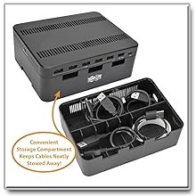 Removable brackets on top of the U280-007-CQC-ST allow it to also act as storage, providing space to neatly organize devices while they charge. Underneath the charging ports is a convenient compartment for storing and organizing cables when they are not in use.