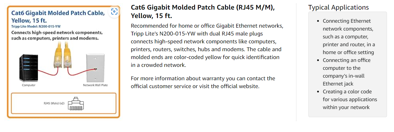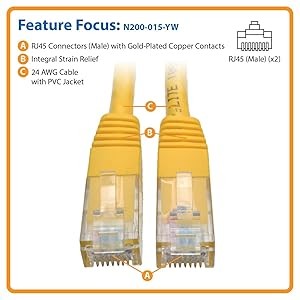 This 15-foot cable is manufactured from 24 AWG 4-pair stranded UTP with a staggered-pin plug design for high-speed connections up to one Gbps. It holds near-end crosstalk (NEXT) levels to a minimum while delivering a flawless signal. The N200-015-YW is designed for 1000Base-T (Gigabit Ethernet), 10/100Base-T (Ethernet), 100 Mbps TPDDI, 155 Mbps ATM, ISDN, voice, Token Ring Type 3 and EIA/TIA applications.