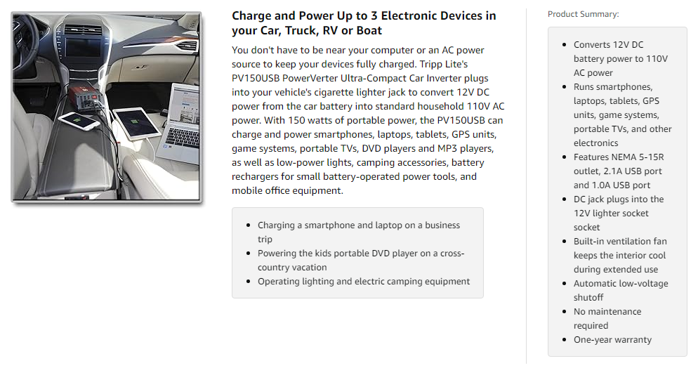 Just connect the DC input plug with 3-foot cord to the 12V outlet in your vehicle, and the PV150USB is ready to operate. To prevent you from running down your battery, the PV150USB turns off automatically if the input voltage falls to 10V or if it gets too hot. For instance, if the connected devices exceed 150 watts, the PowerVerter may overheat and shut down.
