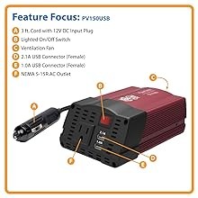Features Both AC and USB OutputsThe portable PV150USB features a NEMA 5-15R outlet, a 2.1A USB charging port and a 1.0A USB charging port, enabling you to charge or power up to three devices simultaneously. In converting the 12V DC power from your vehicle's battery to standard 110V AC power, the PowerVerter produces a continuous output of 150 watts and a peak output of 300 watts. |